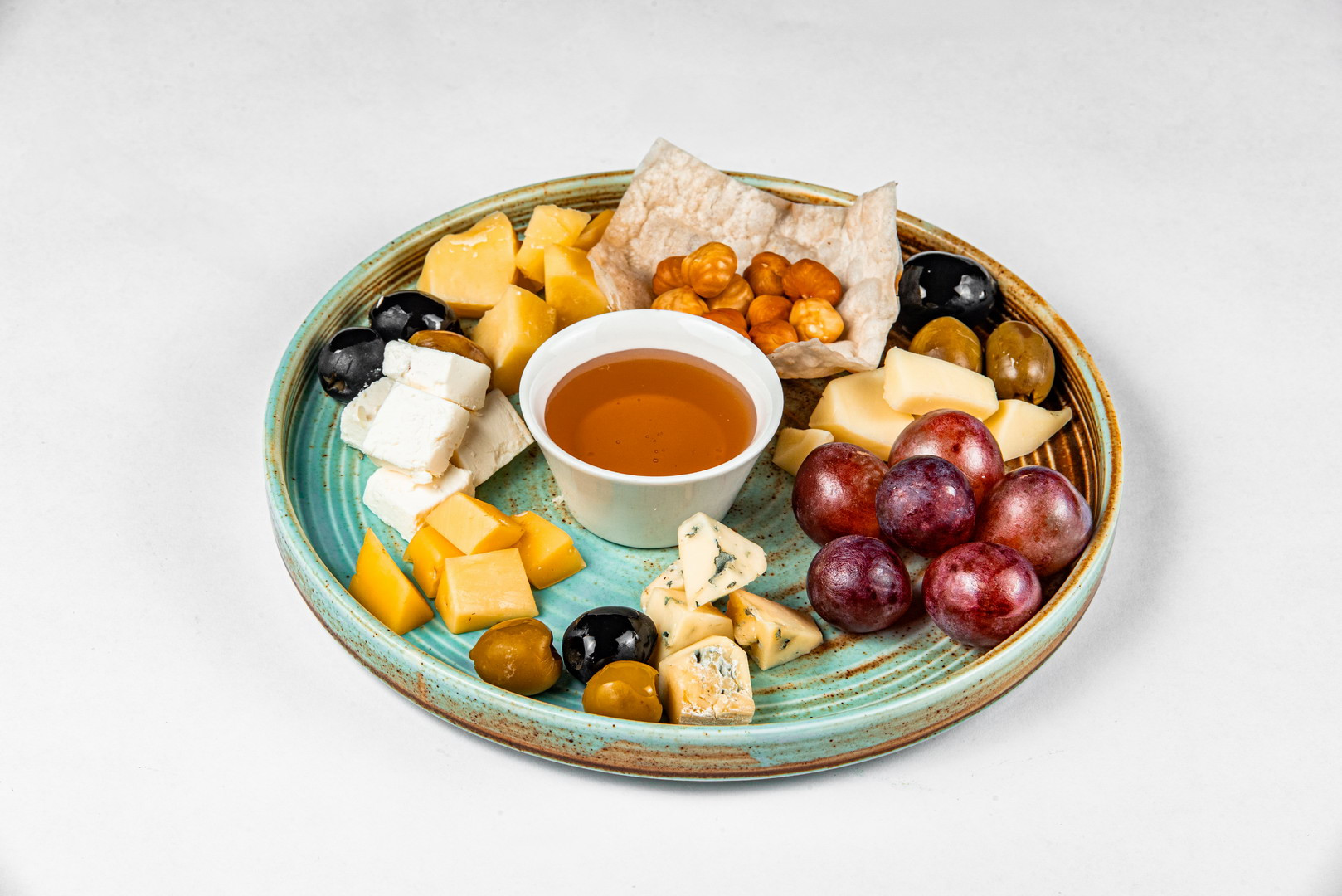 Сыры швейцарский, Дор Блю,твердый сыр, сулугуни, каччота с томатами,оливки,орехи,мёд,виногад,груша